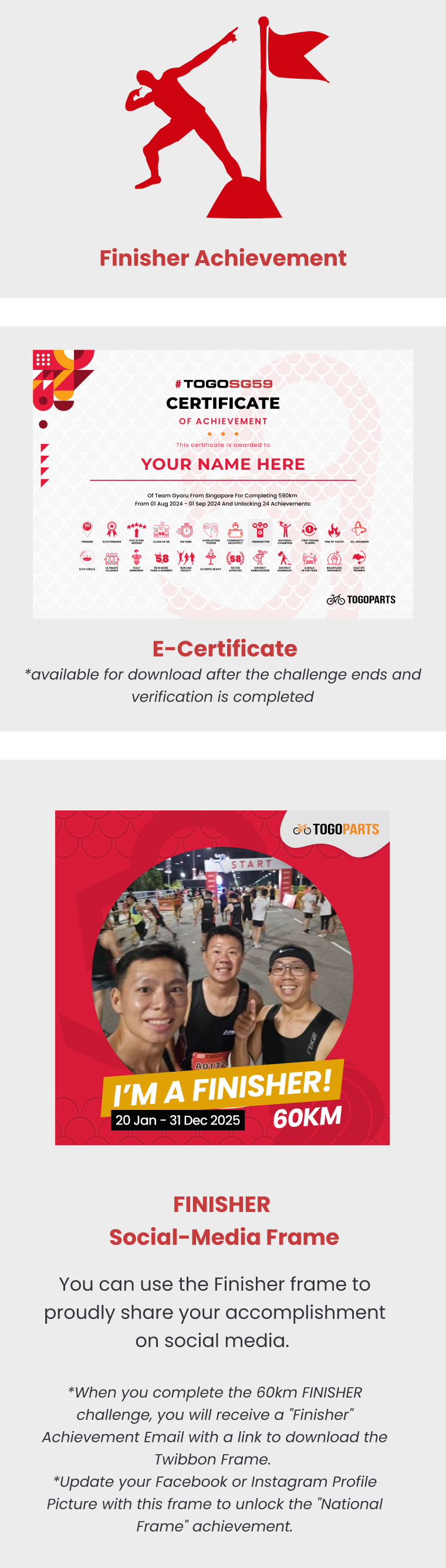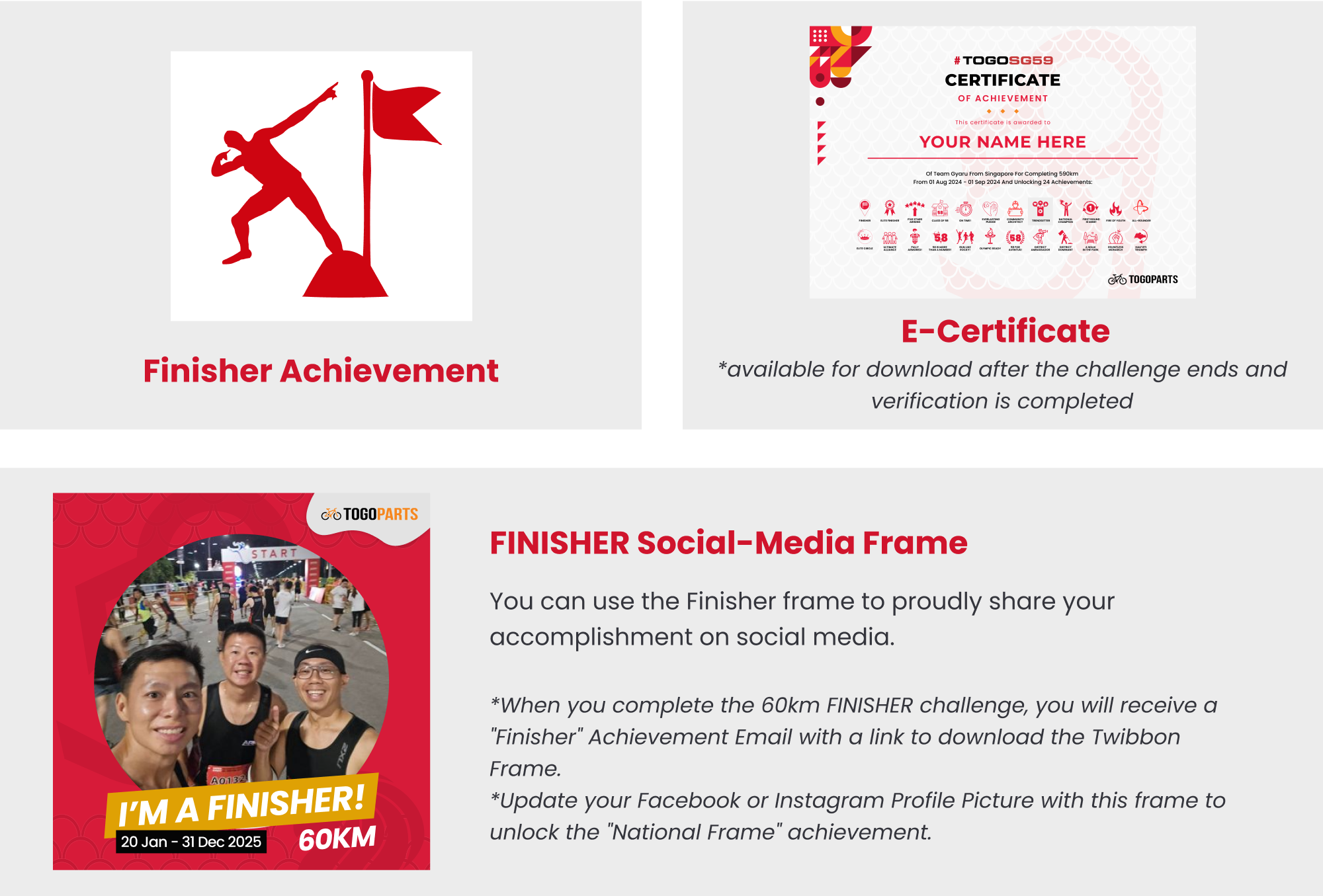 Complete the 60km challenge by cycling or running and earn your spot as a FINISHER at #TOGOSG60PC!